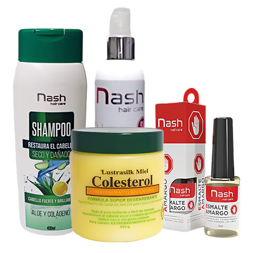 Combo Shampoo Aloé y Colágeno + Desenredante Deluxe + Colesterol Miel + Esmalte Amargo Nash