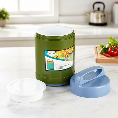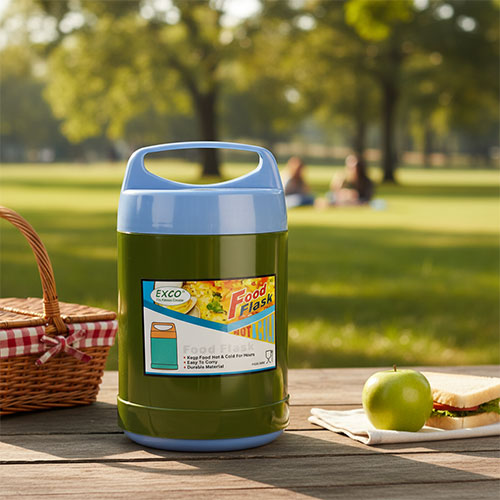 El matraz está hecho de vidrio duradero resistente al calor . El cuerpo del termo está hecho de plástico apto para alimentos de alta calidad . El termo viene con un inserto de plástico para proteger el termo y un recipiente de plástico adicional para poner pan o fruta.